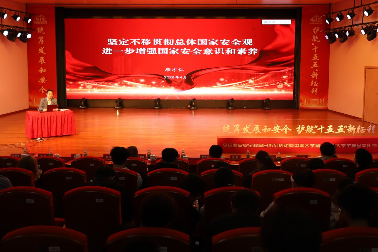 活动还特别邀请省委办公厅唐才仁处长作了《坚定不移贯彻总体国家安全观进一步增强国家安全意识和素养》专题报告。唐才仁阐释了总体国家安全观的四次理论创新,并通过案例分析当前国家安全面临的风险与挑战,号召广大青年学子深入践行总体国家安全观,为维护国家安全贡献青春力量。